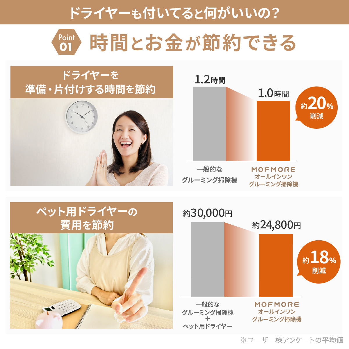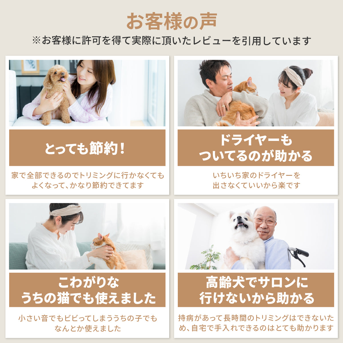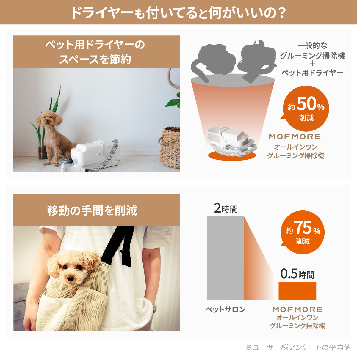 自分でトリミングするときに、ドライヤーだし、掃除機をだし…とするよりもこの1台で完結するのがいいですね。