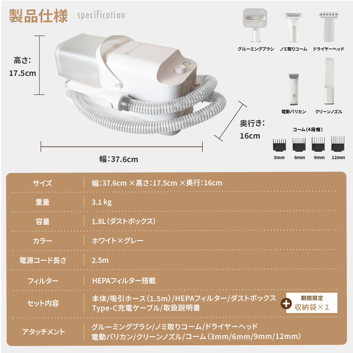 トリミングコームは4種(3/6/9/12mm)付き🪮